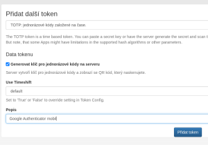 - Authentikátor aplikace – Google Authenticator (Microsoft Authenticator nebo kompatibilní)